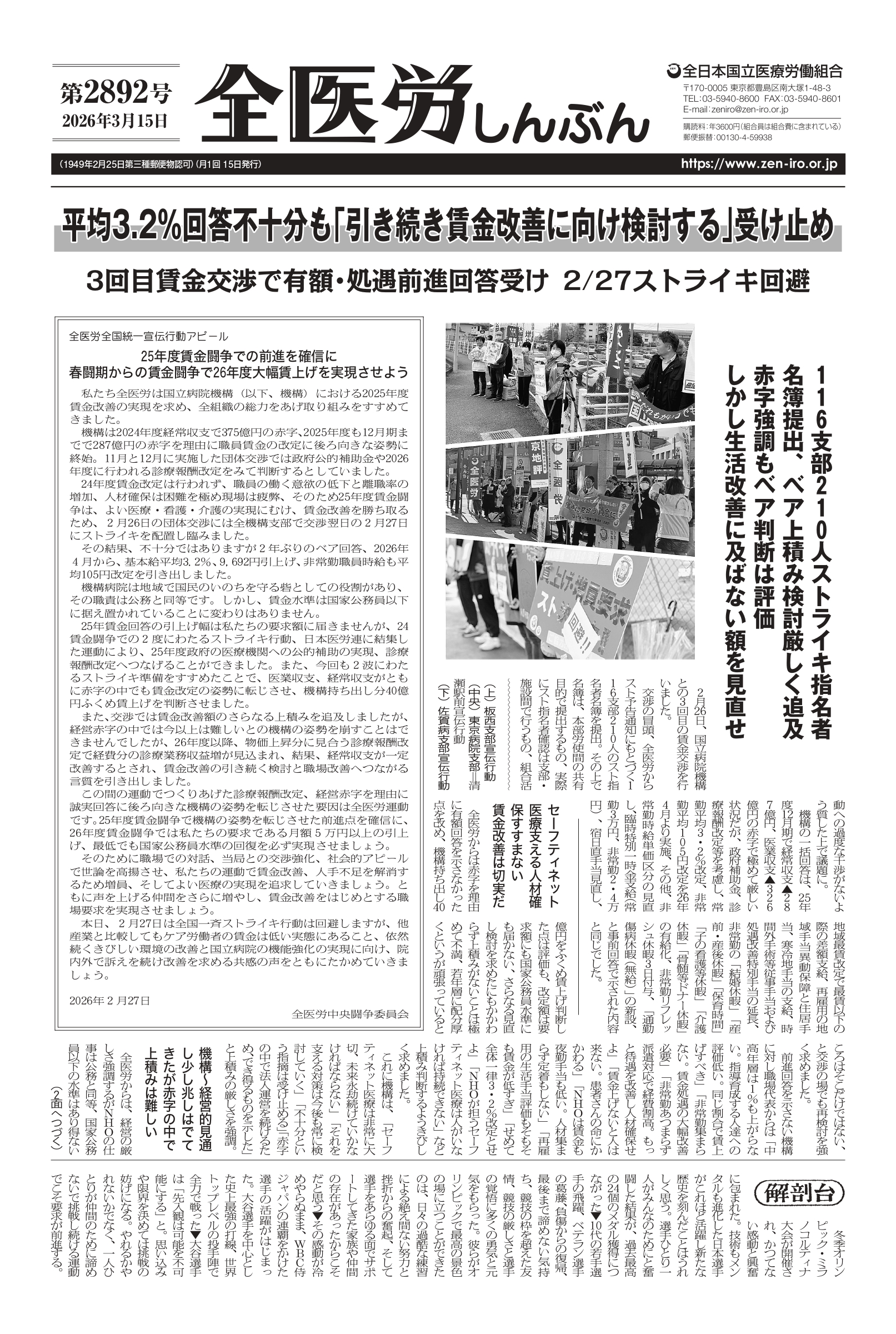 全医労しんぶん第2892号(3月15日号)ができました