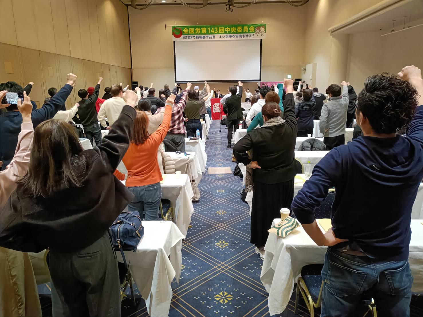 26春闘方針を確立 2026年01月17日掲載 全医労第143回中央委員会全医労第143回中央委員会2日目は、賃金闘争、働き続けられる職場づくりの討論を行った後、前園委員長が26春闘方針案の討論のまとめを行い、満場一致の賛成で運動方針を確立しました(写真は「団結がんばろう」を唱和する参加者)。